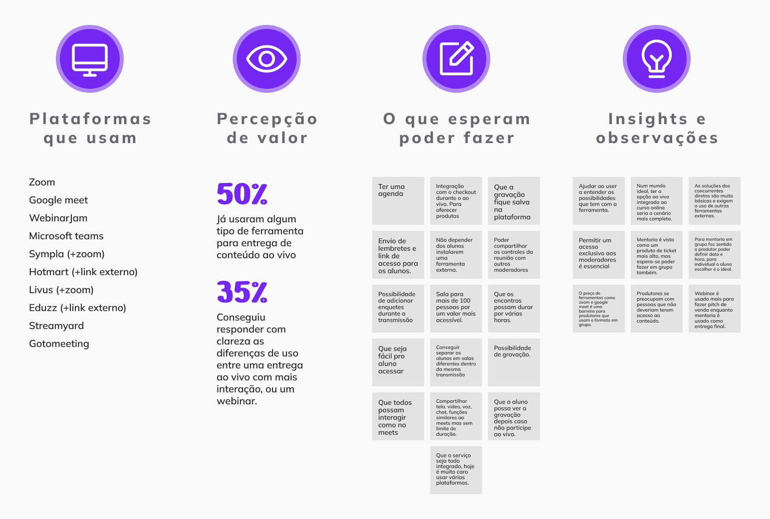 The proposed solution focused on providing a scheduling tool for multiple live sessions, where the infoproduct creator can choose whether or not to record the sessions and automatically make the recordings available on the student’s platform.